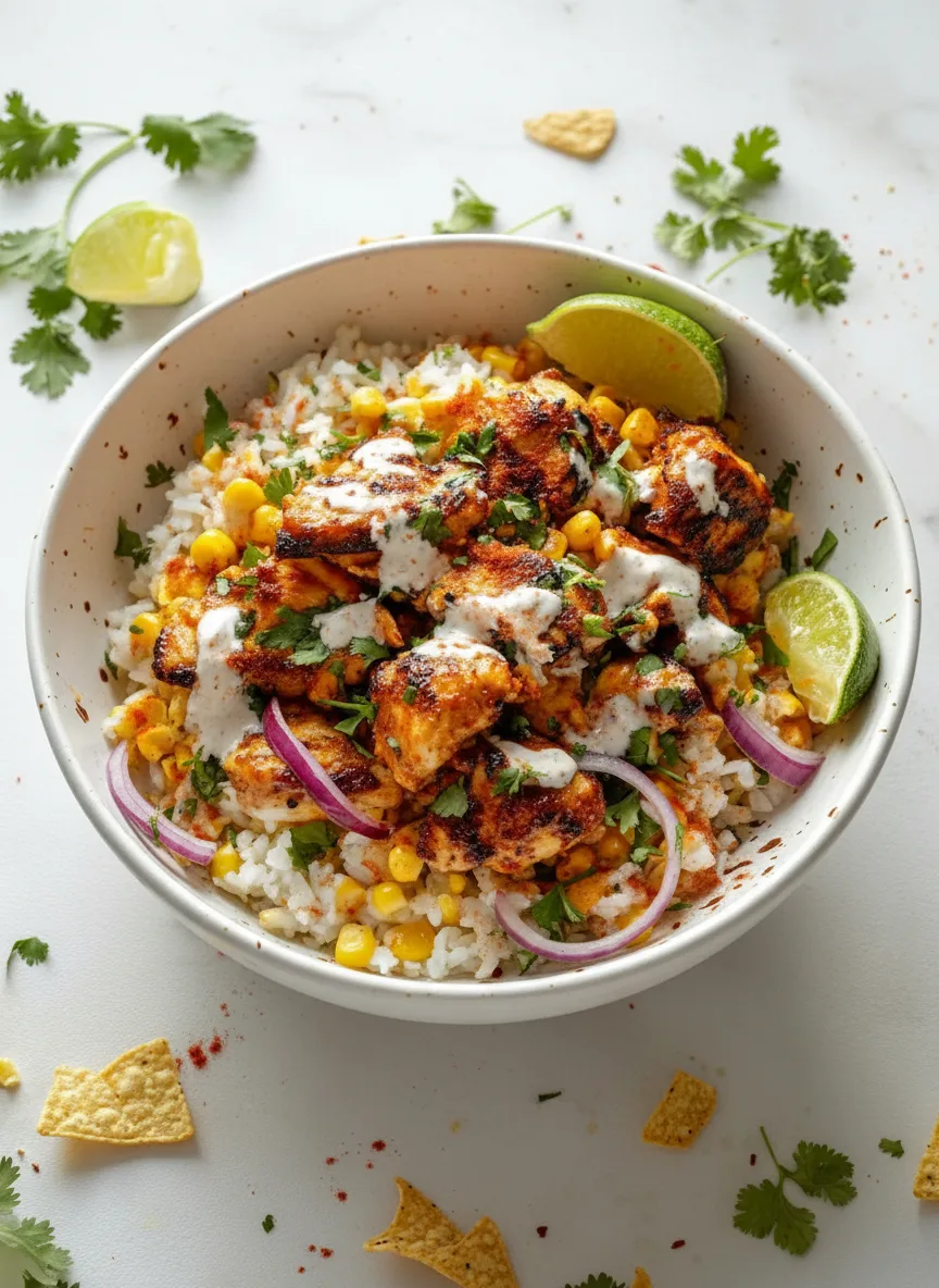 Eine schnelle und geschmacksintensive Reis-Bowl mit mariniertem Hähnchen und cremigem Street-Corn-Topping.