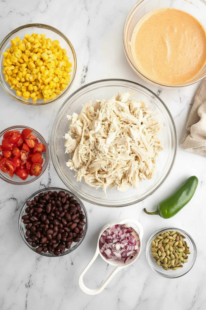 Geben Sie das zerpflückte Hähnchen, Bohnen, Mais, Jalapeños, Tomaten, Zwiebeln und Kürbiskerne in eine große Salatschüssel. Verrühren Sie die Zutaten vorsichtig mit einem Gummispatel, bevor Sie das Dressing hinzufügen.