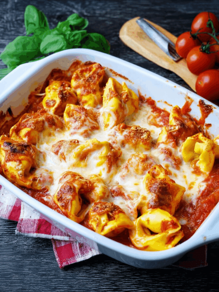 Cremiger Tortellini-Auflauf mit Tomaten-Sahne-Sauce, Mozzarella und frischen Kräutern – ganz einfach im Ofen zubereitet und perfekt für die ganze Familie.