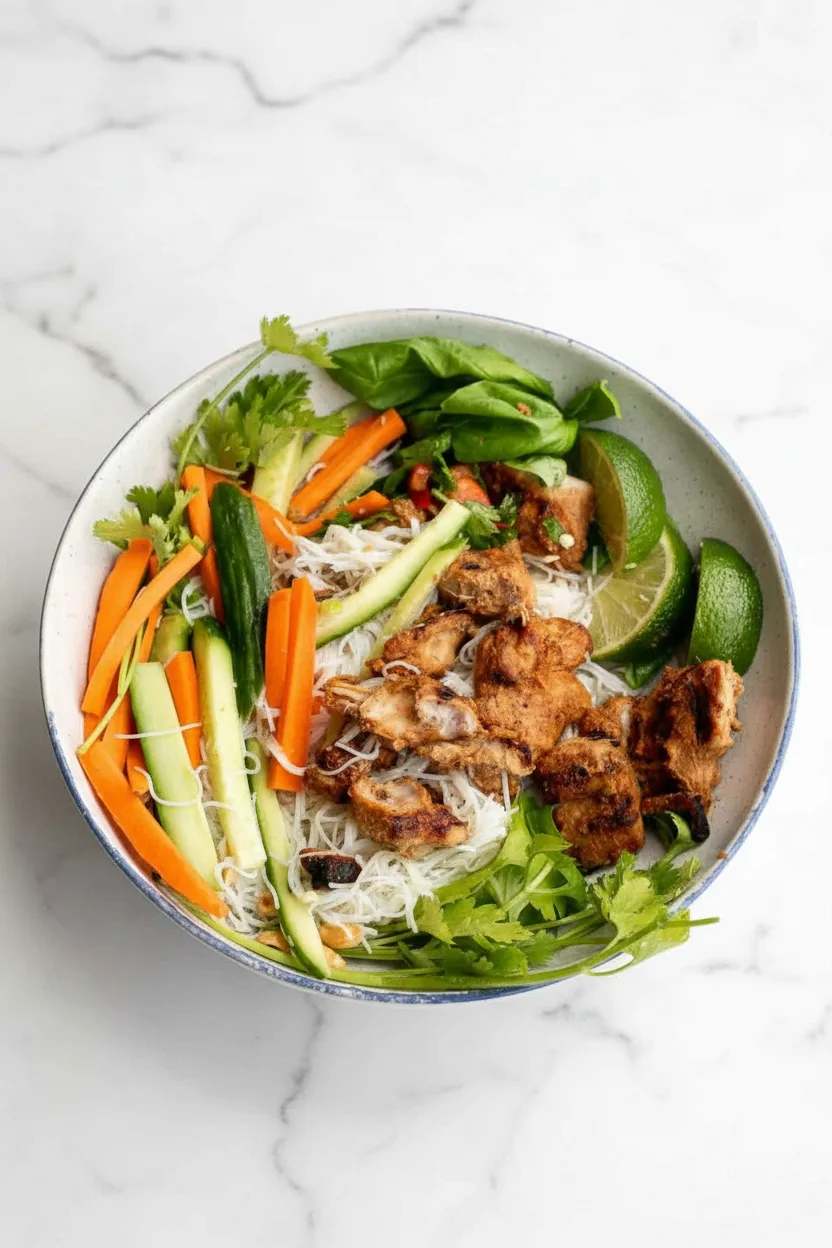 Frische vietnamesische Nudel-Bowl mit mariniertem Hähnchen, knackigem Gemüse und aromatischer Saße