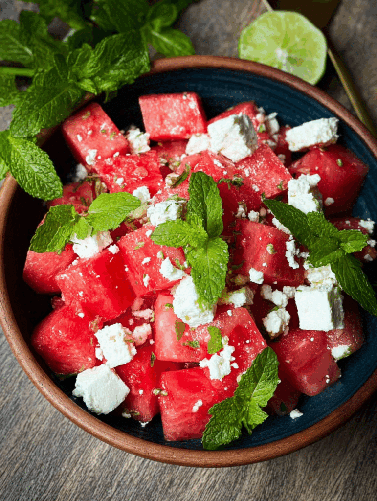Ein frischer, sommerlicher Salat mit süßer Wassermelone, cremigem Feta, Limettendressing und Minze – ideal für heiße Tage, Picknicks oder Grillabende.