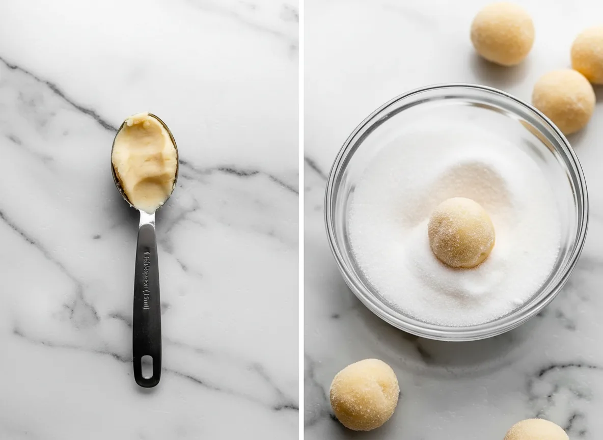 Forme etwa 36 Kugeln à 18 g. Wälze jede in Kristallzucker und platziere sie mit Abstand auf Backblechen. Drücke mit dem Daumen eine Mulde in jede Kugel und fülle je 1/2 TL Zitronencreme ein. Kühle die geformten Kekse während des Ofenvorheizens.