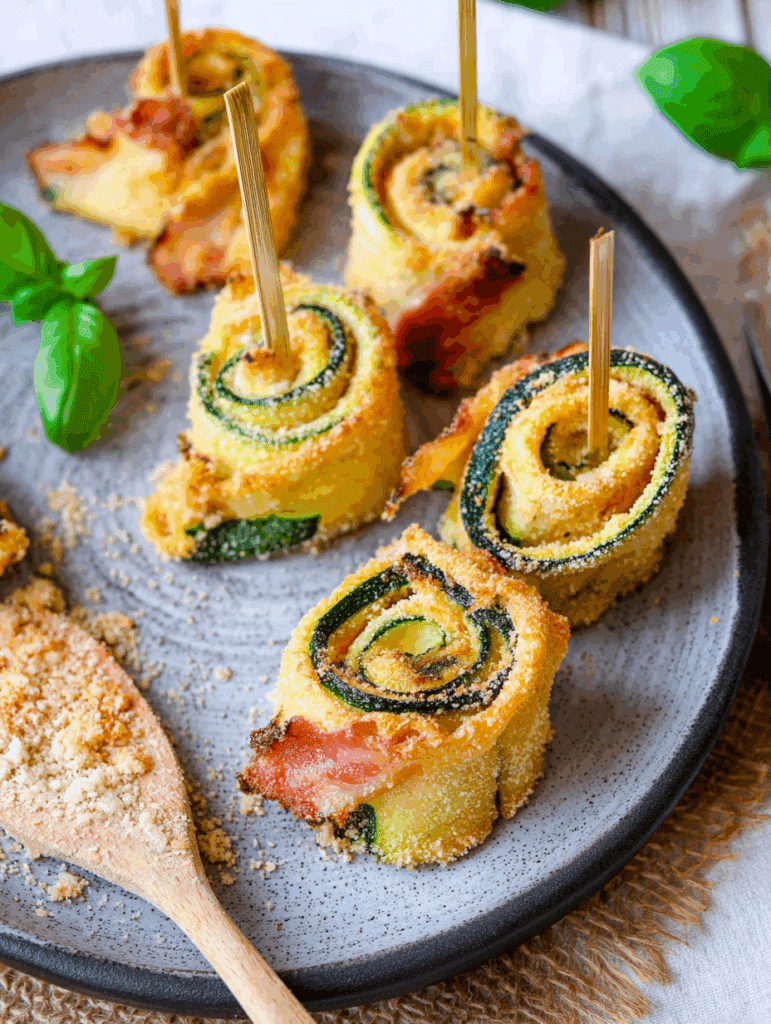 Knusprige Zucchiniröllchen aus der Heißluftfritteuse – gefüllt mit würzigem Käse und feinem Schinken. Ein schneller Low-Carb-Snack, ideal für Familie, Gäste oder als Meal-Prep.